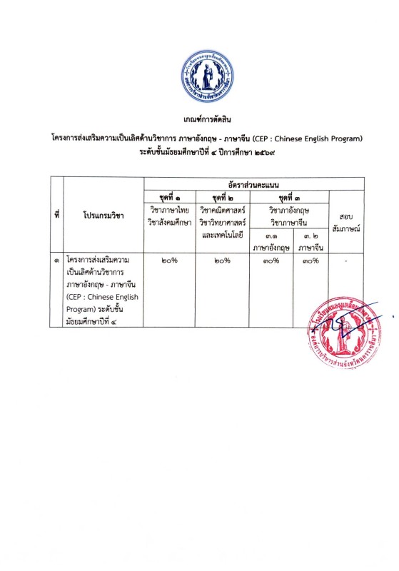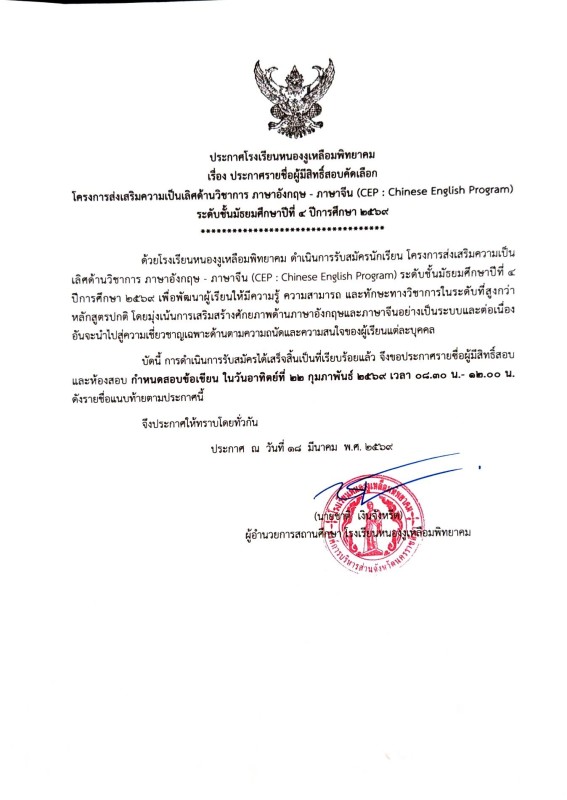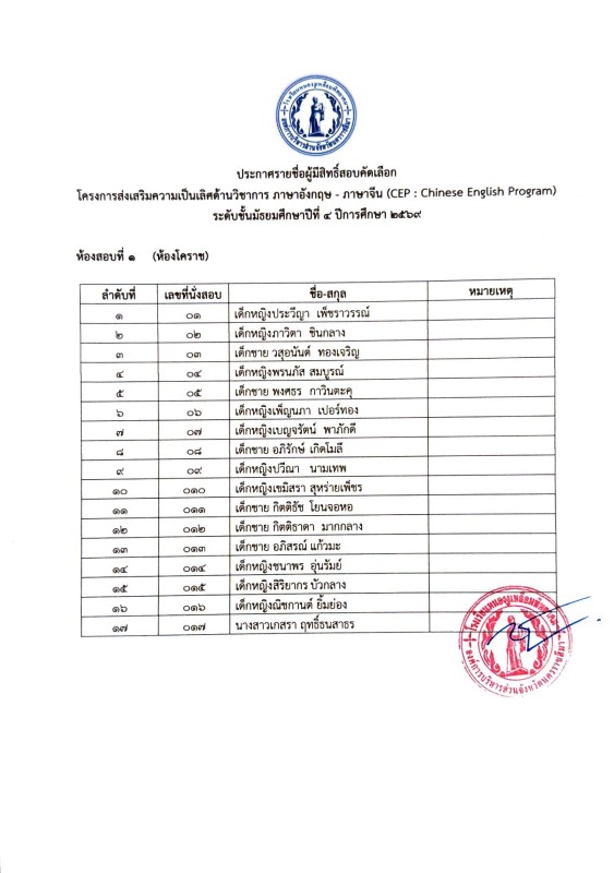 เรื่อง ประกาศรายชื่อผู้มีสิทธิ์สอบคัดเลือก โครงการส่งเสริมความเป็นเลิศด้านวิชาการ ภาษาจีน - ภาษาอังกฤษ (CEP : Chinese English Program) ระดับขั้นมัธยมศึกษาปีที่ 4 ปีการศึกษา 2569 |